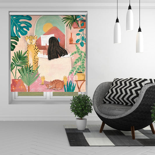 Woman taking bath in pink tropical bathroom Printed Picture Photo Roller Blind - 1X2663166
