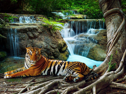 Tiger Lying Under Banyan tree next to jungle cascade Printed Picture Photo Roller Blind - RB712