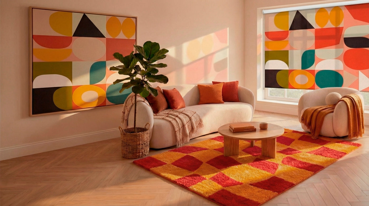 Choose from a variety of distinct styles and textures, including the shaggy finish of the Moodi Shaggy Multicolour Tidecrest Rug or the hand-tufted wool of the Paradise Leaf Hand-Tufted Wool Rug – Cream/Green. Whether you are looking for classic, stark contrasts with the Joli Geometric Black & White Rug or warm, retro-modern tones, these statement pieces pair perfectly with vibrant wall art and custom printed roller blinds to complete your space.